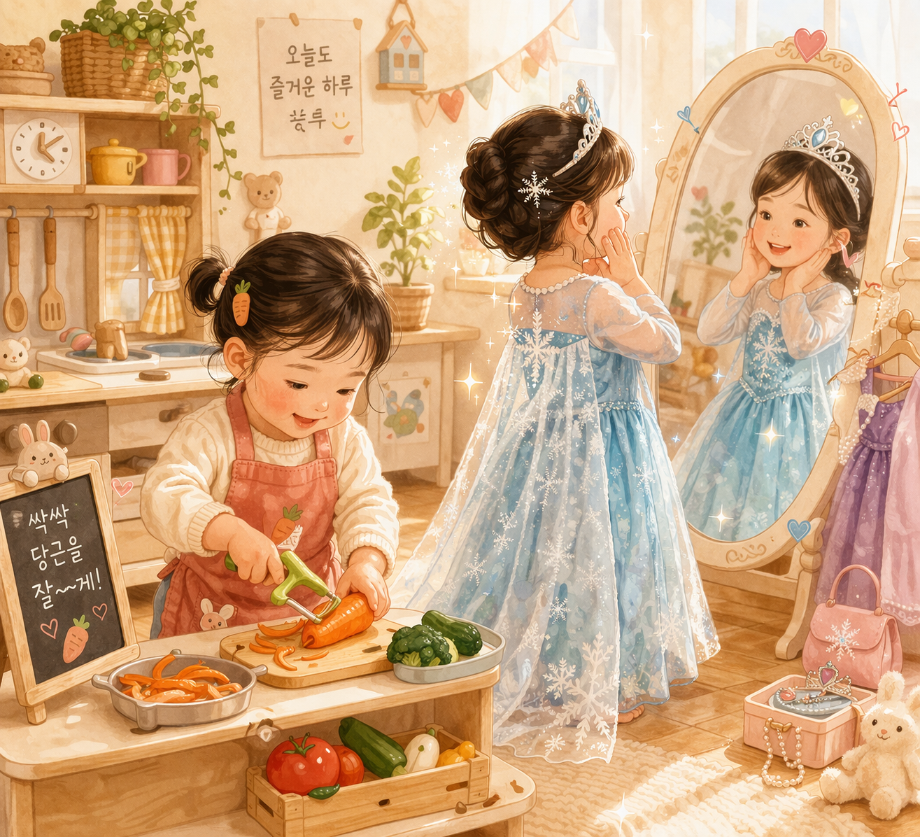 • 공주놀이 (드레스, 화장대): 자아 정체성이 생기며 '예쁜 것'에 반응하는 시기입니다. 아이의 색감 감각을 키워주기 좋은 기회예요.